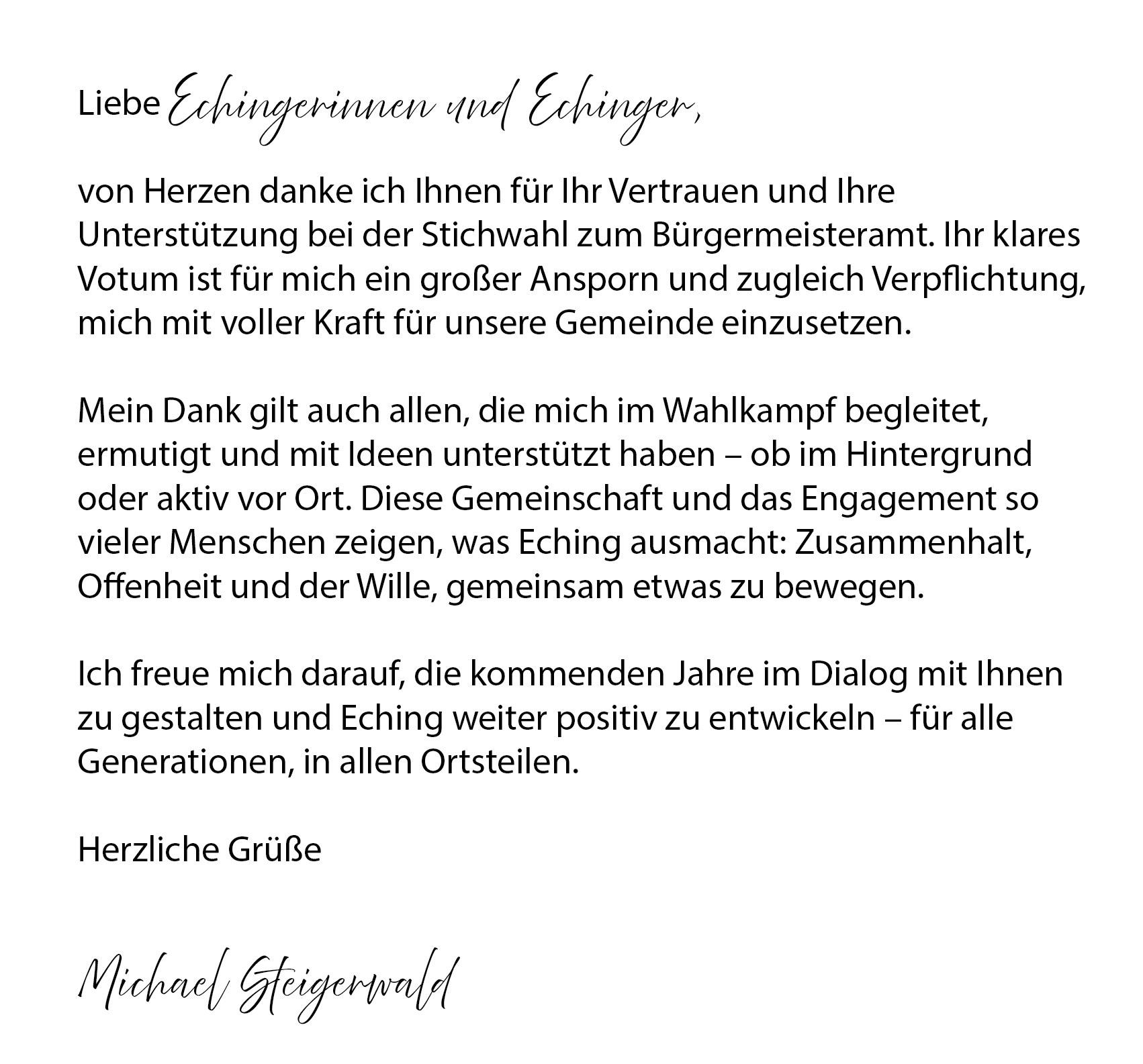 „Michael Steigerwald ist bestens als zukünftiger Bürgermeister von Eching geeignet. Seine ruhige, menschliche und sachbezogene Art befähigt ihn bestens für dieses Amt. Er ist meines Erachtens ein Garant, Probleme sachlich zu lösen und zum Wohle der Bevölkerung zu arbeiten. Eching verdient einen integren und volksnahen Bürgermeister.“