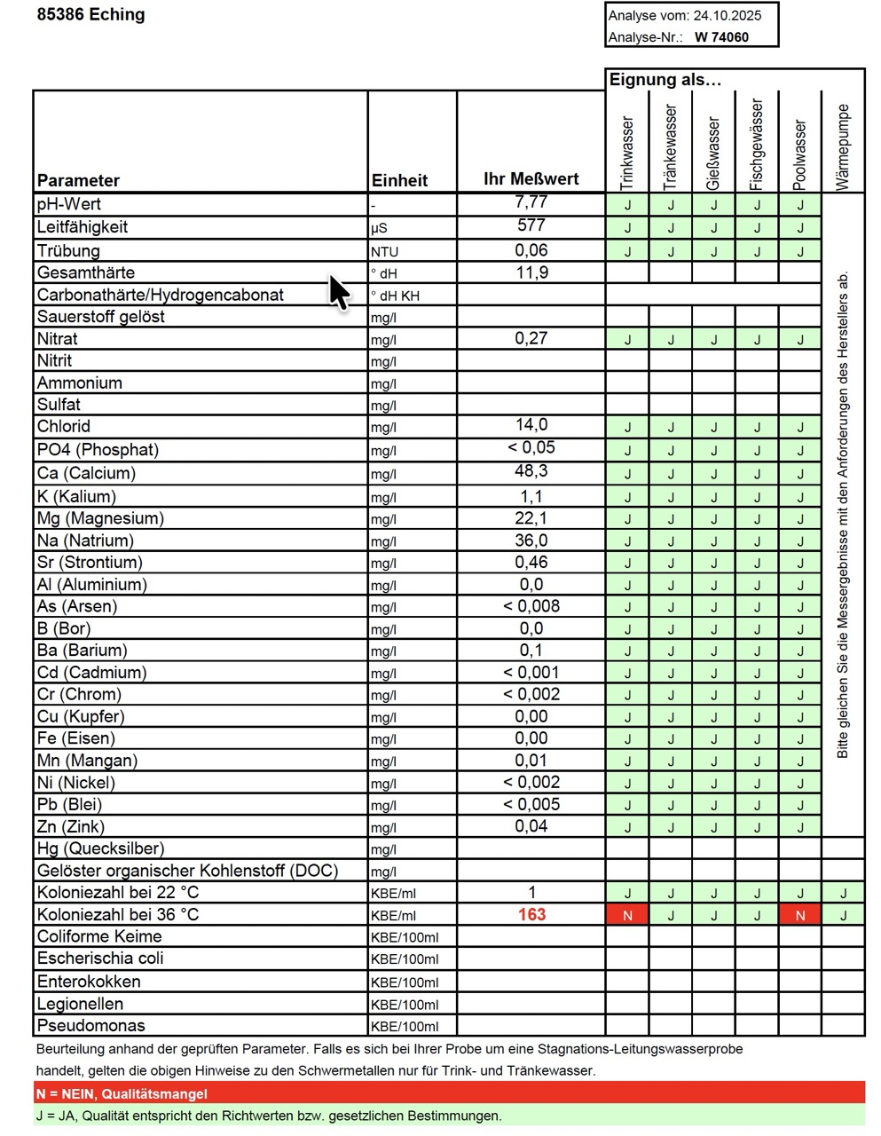 • Cadmium: < 0,001 mg/l, Grenzwert 0,003 mg/l
